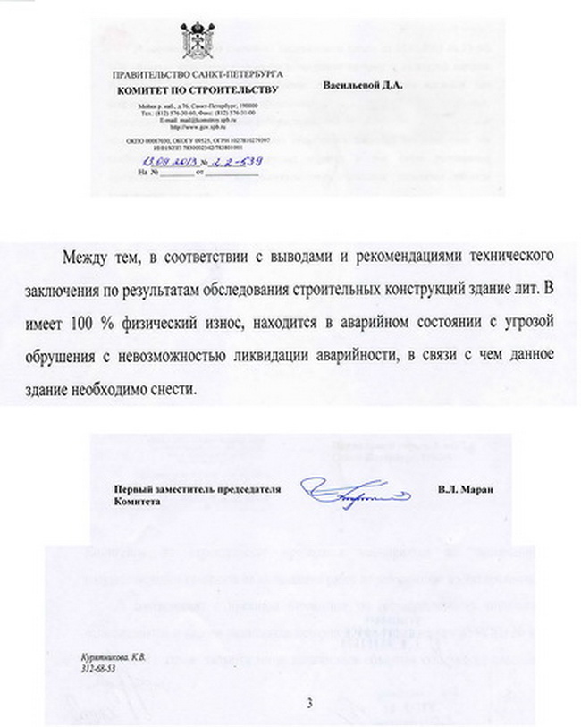 Ложь в том, что дворовый флигель был признан не просто аварийным. Он был признан СТОПРОЦЕНТНО аварийным. Так и писали в ответах мне чиновники: «износ 100%». Посмотрите на ответ Комитета по строительству в мой адрес.