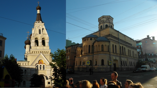 От истории Песков перешли к истории места сбора. Сейчас здесь стоит БКЗ «Октябрьский». Когда-то в этой части города проживала греческая диаспора, поэтому под руководством и при финансовой поддержке грека-предпринимателя Дмитрия Бенардаки на этом самом месте в 1865 году была построена греческая Церковь Святого великомученика Димитрия Солунского. Здание церкви пережило Октябрьскую революцию, но в 1962 году его, полуразрушенное, снесли ради постройки концертного зала. Рассказ сопровождался показом изображения церкви. Из группы экскурсантов в этот момент донеслось: «Сегодня не сравнить!.. Коробочка».