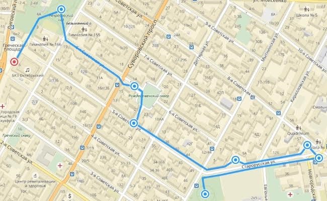 От истории Песков перешли к истории места сбора. Сейчас здесь стоит БКЗ «Октябрьский». Когда-то в этой части города проживала греческая диаспора, поэтому под руководством и при финансовой поддержке грека-предпринимателя Дмитрия Бенардаки на этом самом месте в 1865 году была построена греческая Церковь Святого великомученика Димитрия Солунского. Здание церкви пережило Октябрьскую революцию, но в 1962 году его, полуразрушенное, снесли ради постройки концертного зала. Рассказ сопровождался показом изображения церкви. Из группы экскурсантов в этот момент донеслось: «Сегодня не сравнить!.. Коробочка».