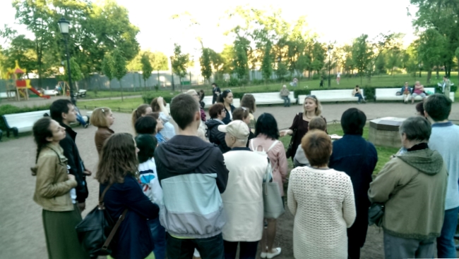 Далее экскурсия проследовала в Некрасовский сад, также известный как сад «Прудки». Как следует из названия, когда-то там располагались пруды. Эти пруды-накопители питали фонтаны Летнего сада. В 1885 году, после запроса жителей Песков, здесь был обустроен сквер, который после засыпки Лиговского канала и прудов-накопителей в 1891 году был расширен, и к 1893 году получил название Греческого сада. Переименован этот сад был при советской власти, которая, в честь когда-то жившего рядом с этим местом Н.А. Некрасова, и назвала его Некрасовским. Сад окружают здания доходных домов и двух гимназий. Экскурсовод обратила наше внимание на жилой комплекс Бассейного Товарищества, только недавно освободившийся от строительной сетки.
