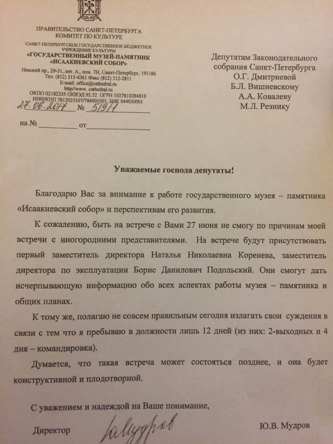 Директор Исаакиевского собора не пришел на встречу с депутатами. Но встреча состоялась