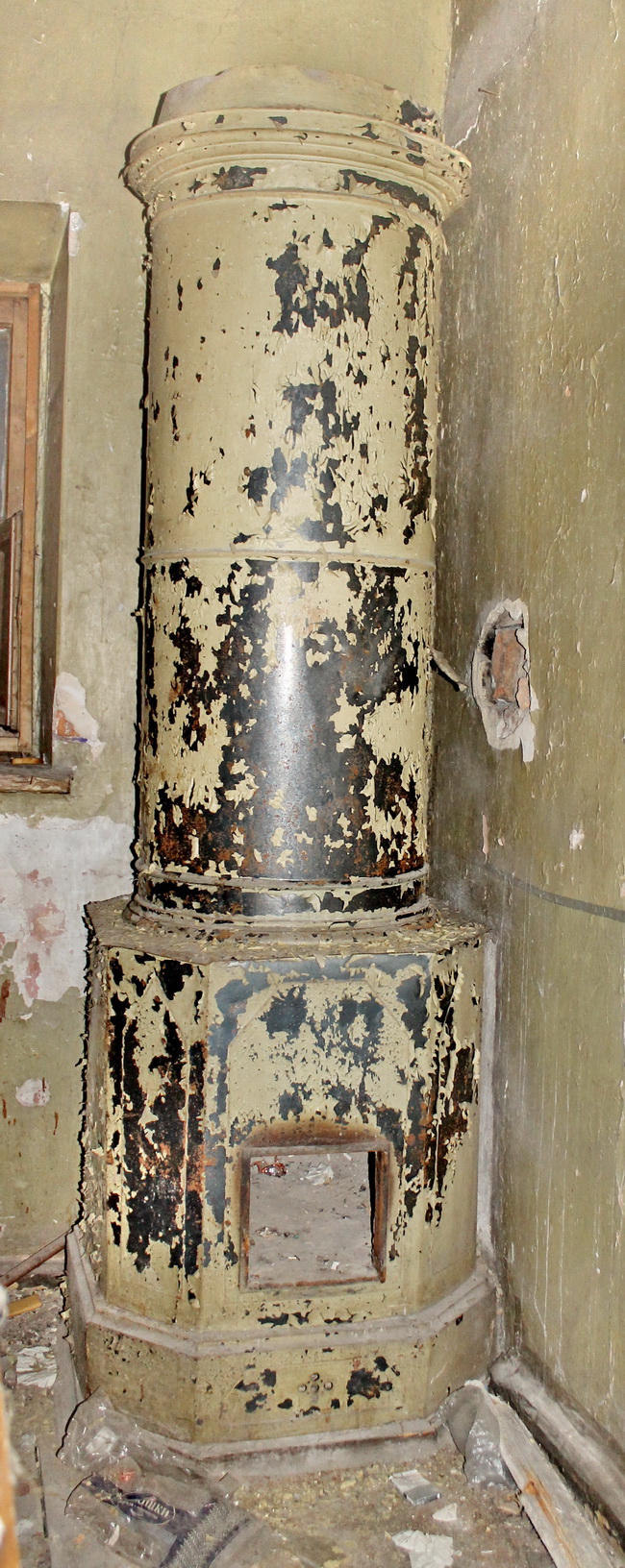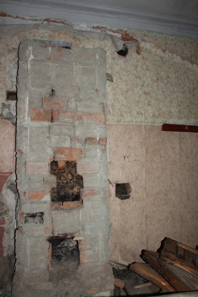 Идём дальше. Исторические двери ещё целы, но, как и в особняке Игеля, уже валяются на полу. В каждой комнате потолочная лепнина, розетки и белоснежные изразцовые печи с ажурными навершиями. Правда, их уже «раздевают» мародёры. Скоро охранник проспит последнюю печь: рядом с ней уже лежат сбитые изразцы.