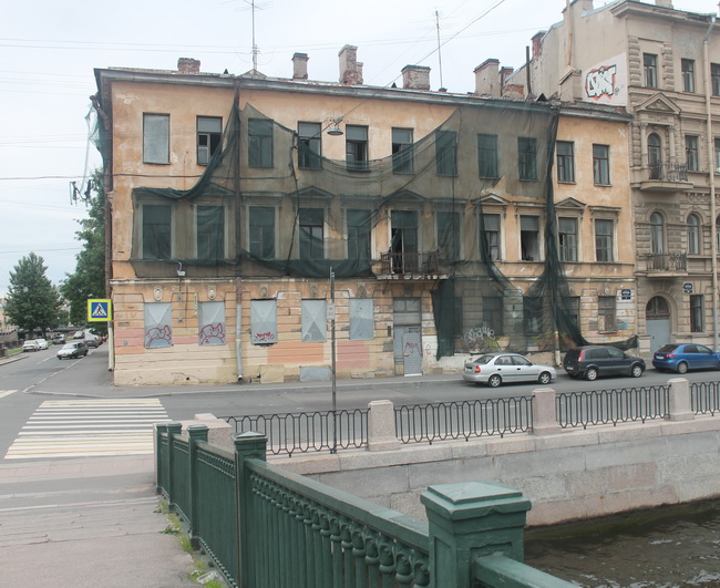 Зрелище заброшенного дома на углу Крюкова канала и набережной Фонтанки уже столь привычно, что кажется, будто этот небольшой домик пустует уже сто лет. На деле же десять: расселение грянуло внезапно, согласно постановлению Правительства Санкт-Петербурга № 1586 от 21.09.2004 года. То есть, дом приговорили не за пресловутую (часто надуманную) аварийность, а ни за что ни про что. И так уже десять лет ни за что ни про что гробят. Но небольшой трёхэтажный дом ещё достойно держится. И, между прочим, является региональным памятником.