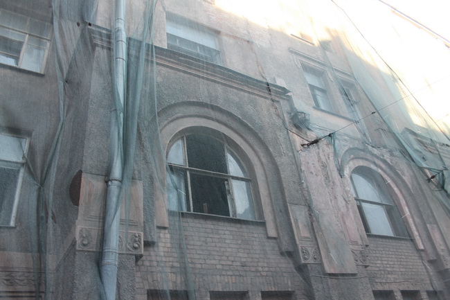 Тёплый летний вечер. Уставший за день троллейбус, за окнами которого мелькают виды Петроградской стороны. На какой-то момент автор этих строк «прилипает» к стеклу. Что там за зелёная сетка? К счастью, остановка как раз напротив фасада. Читатель, выходим. Да это же Большая Пушкарская, 7. Дом Басевича… В этих «тенётах» его и не узнать.