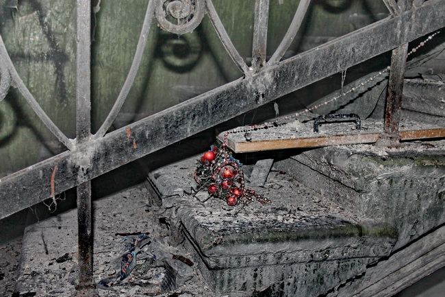 Пуст и холоден дом Басевича. Громадные коммуналки, опустев, кажутся бесконечными. Темно, пыльно. Путь по лабиринтам коридоров преграждает ещё не успевшая сгореть сломанная мебель. Вещи раскиданы, как после обыска или срочной эвакуации. Так спешно пытались покинуть этот дом жильцы. А после «антуража» добавили мародёры. Каминов нет, витражей нет. Розетки лежат на полу или болтаются «на ниточках» проводов. Всё это там, куда ещё можно пройти. Дальше – страшное, чёрное, сгоревшее… В идеальной сохранности только лестницы с мозаичной плиткой. На ступеньках одной из них – в спешке брошенное ёлочное украшение. Праздник кончился…
