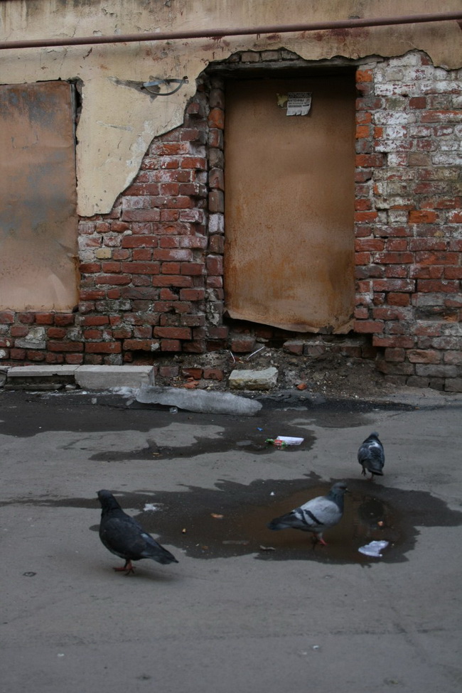 Внутри всё простенько: ни лестниц, ни интерьеров. Впрочем, барельефы с зеркалами здесь и не нужны. Это же сарай, в котором когда-то доверху лежали дрова. Что в нём сейчас? Среди заколоченных проёмов есть один, на котором висит замок. Периодически его открывают сотрудники местной жилконторы, и в темноте (электричеством постройка не оборудована) проглядывают мётлы, совки и прочая дворницкая утварь. То есть, до сих пор служит людям трудяга-сарай. И, хоть и с виду неказист, падать никуда не собирается. Служит он ещё и голубям: стаи пернатых давно облюбовали эту крышу и явно считают её своей.