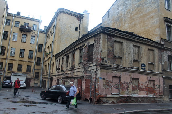 Сарай каменный, и внешне напоминает флигель, примыкающий к соседнему зданию. Только стоит этот «флигель» несколько странно – поперёк улицы: фасадом развёрнут не на улицу, а в глубину участка. Лицевого корпуса (главного дома) на участке нет. Нет так давно, что каким он был, не помнят даже старожилы – история, похоже, очень давняя. Ничего не удалось «накопать» и местным краеведам. Известно лишь, что на пустующем ныне участке когда-то стоял особняк Н.А. Лыткина. Кем был этот Лыткин и являлся ли он родственником тех Лыткиных, чей дом за номером 51-53 стоит на набережной Фонтанки – неведомо. По запросу «Н.А. Лыткин» энциклопедии выдают лишь Николая Александровича, оператора советского кино. Но по времени проживания родившийся в 1910-м и умерший в 1991-м году Николай Александрович во владельцы утраченного особняка явно не попадает – по историческим данным, особняк Лыткина построен в 1884-м году архитектором Иваном Ивановичем Радике. Рождён Иван Иванович был в 1831-м году, умер в 1887-м, был вольноприходящим учеником Академии художеств. В 1853-м получил звание свободного художника, а с 1860-го он уже академик архитектуры за «проект Городской Думы». Среди Лыткиных же – архитектор и художник-акварелист, ярославский купец начала XVII века, поэт и финно-угровед из Коми, российский историк, ректор Калужского педагогического университета, сибирский епископ, ещё одни поэт (революционер) и серийный убийца (по данным «Википедии»). Кто из предков этих знаменитостей владел особняком? Это загадка.