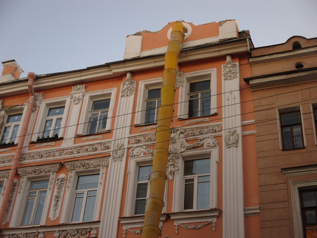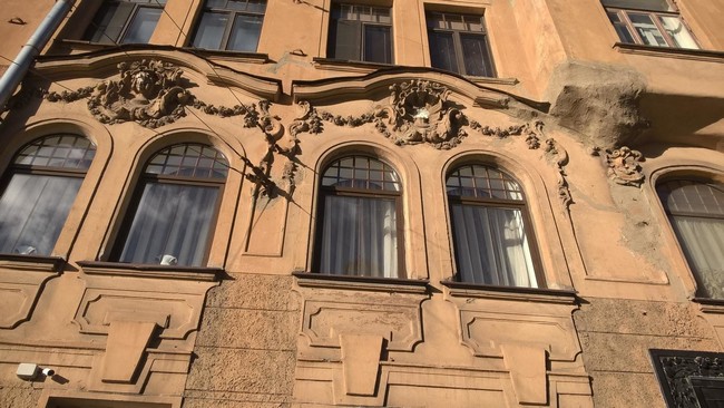 В апреле с регионального памятника, где жил Д.Д. Шостакович, по Загородному пр., 64 упала лепнина, так же нанесшая повреждения случайному прохожему.