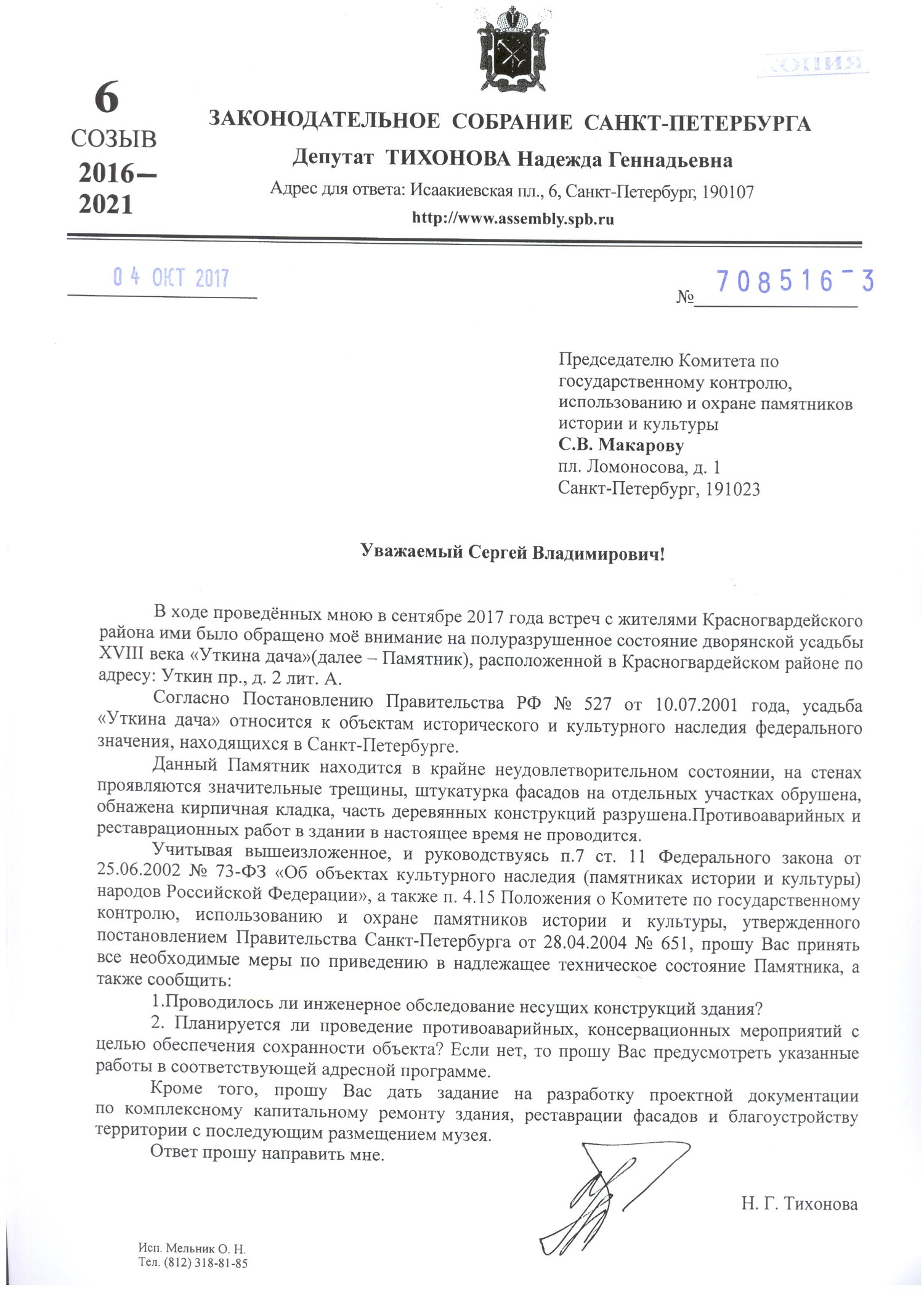 Депутат-справедливоросс Законодательного собрания Санкт-Петербурга Надежда Тихонова направила председателю Комитета по государственному контролю, охране и использованию памятников Сергею Макарову обращение с требованием срочно принять меры против разрушения памятника федерального значения, дворянской усадьбы XVIII века «Уткина дача».