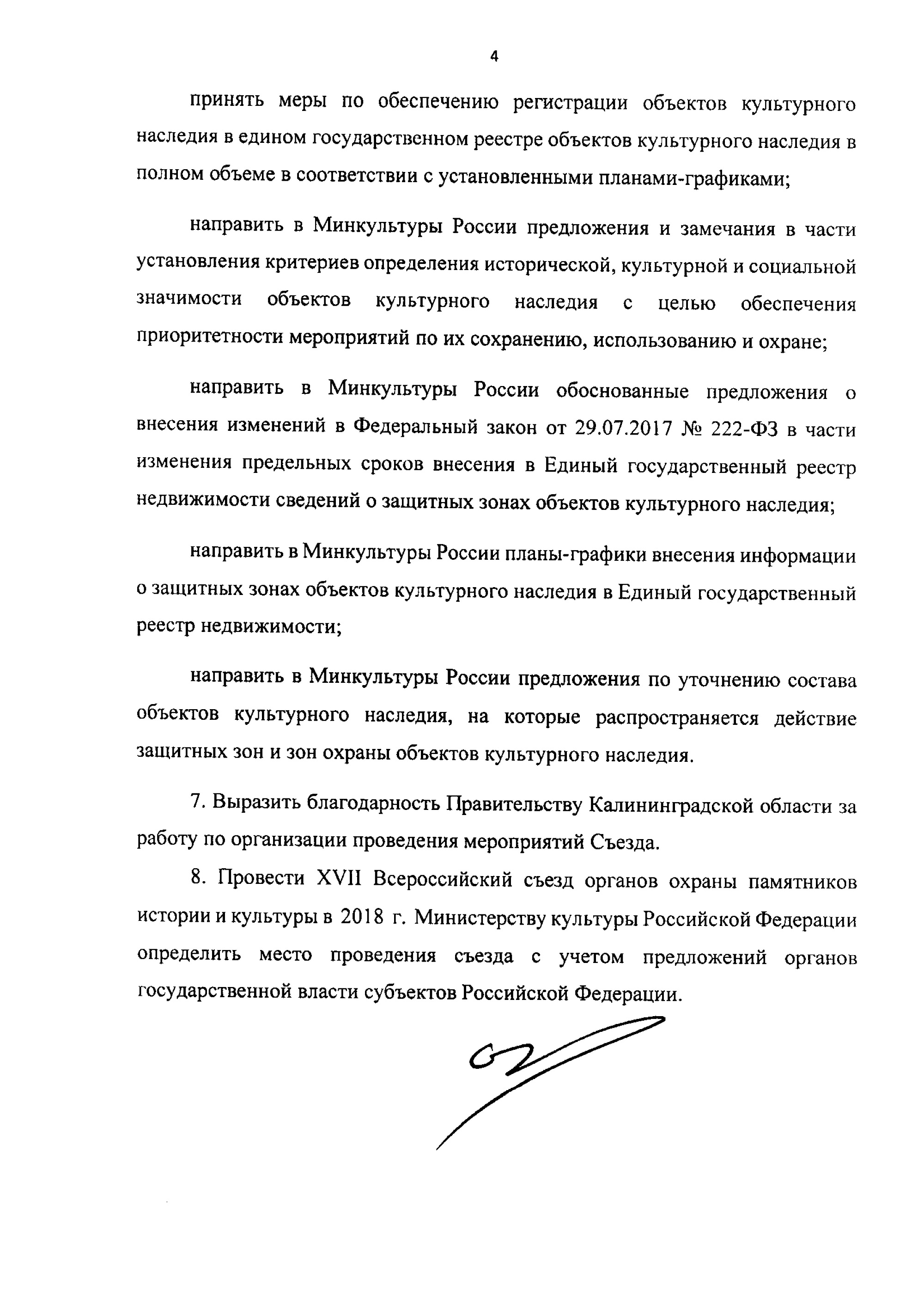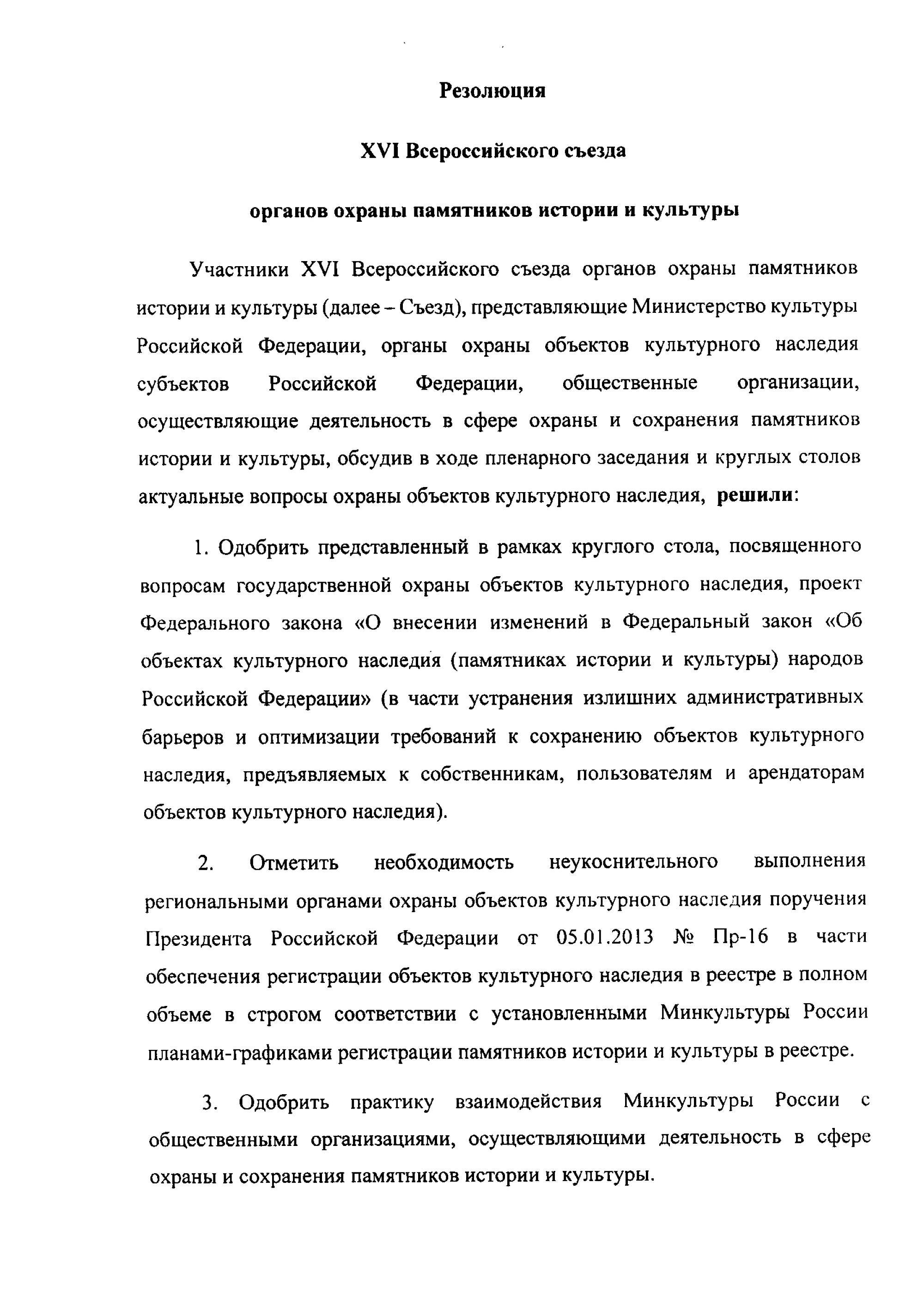 Участники съезда рассмотрели и одобрили проект изменений в ФЗ «Об объектах культурного наследия (памятниках истории и культуры) народов Российской Федерации», рекомендовали Министерству культуры продолжить формирование единого государственного реестра объектов культурного наследия, привлекать общественные организации к мероприятиям Минкульта по охране объектов культурного наследия, обеспечить разработку ряда нормативных и методических документов.