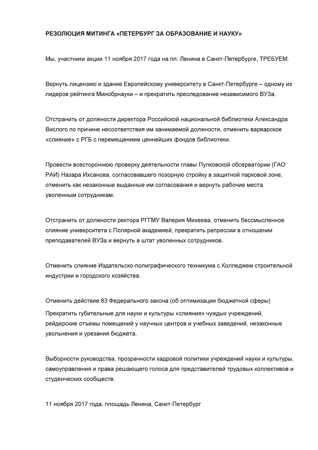 Участники митинга говорили также о проблемах Европейского университета, Российской национальной библиотеки, и других. Выступили депутат Законодательного Собрания Петербурга Борис Вишневский, профессор Европейского университета и Университета Хельсинки Владимир Гельман, кандидат в президенты Ксения Собчак, отец которой Анатолий Собчак стоял у истоков создания Европейского университета, студенты, гражданские и политические активисты.