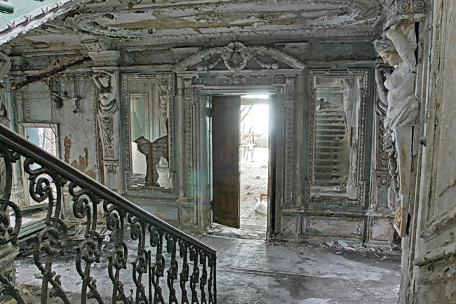 Внутри не просто красиво. Роскошно! Роскошно настолько, что захватывает дух. Такого великолепия нет даже в Эрмитаже. Торжественная лестница, встречающие у входа кариатиды, вьющиеся по стенам лепные гирлянды роз, ангелы… Но печальны и измучены лица ангелов. А у кариатид взгляды узниц концлагерей. Одна из кариатид разбита. Зеркала утрачены, позолота осыпалась блестящей пылью. Лепнина лежит на полу. Некоторые балясины парадной лестницы в лапах мародёров. Изразцовые печи ободраны. В залах проваливается пол. Редчайшие витражи утрачены. В том числе, скорее всего, единственные в мире парные витражи. Писали, что они были сфотографированы энтузиастами и даже отреставрированы, но зачем-то сложены в ящики в том же особняке – обречены на гибель в пыли и сырости. И, разумеется, украдены всё теми же мародёрами. Состояние интерьеров не просто печальное. Оно жуткое. И разрывает сердце всё та же боль, что и в особняке Игеля. И те же вопросы летят в пустоту: как? Почему? За что?! Стоишь, оглядываешься, и кружится голова. То ли от красоты, то ли от ужаса. Утрачено, обвалено, разграблено…