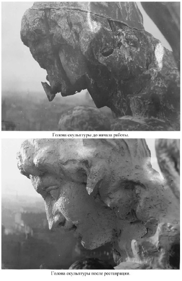Обследовав ангела, он пишет о серьезных разрушениях деревянной скульптуры, ее металлического каркаса и свинцовой оболочки. В ходе работ были восполнены утраты, дерево было пропитано олифой, мелкие изъяны заполнили специальной замазкой. Наиболее тяжелым было состояние головы ангела — нужно было пропитать полуистлевшее дерево раствором, который бы сцементировал его. В итоге было принято решение заполнить пустоты замазкой, изготовленной из белил, разведенных на олифе.