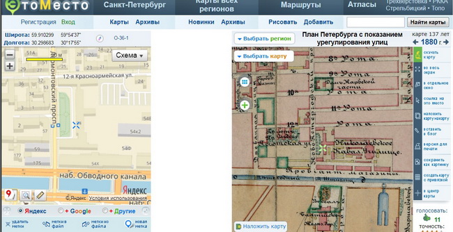 Наконец, 1880-й год. «План Петербурга с указанием урегулирования улиц». Две чёткие линии на углу канала вдоль проспекта – это и есть наши склады. Через канал уже (и давно) перекинут Штиглицкий мост.