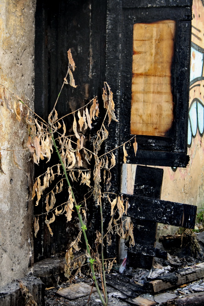 Практически везде уже побывал огонь. Один большой корпус изнутри уже выжжен: осталась лишь чудом уцелевшая, но обугленная «сетка» из балок и остатков перекрытий.