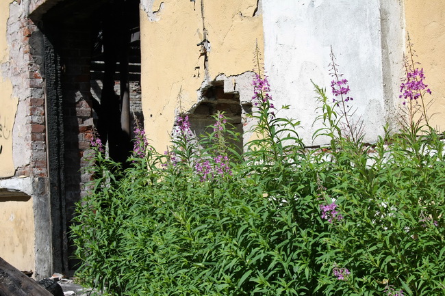 Сворачиваем с набережной на Лермонтовский проспект и видим второе, сильно сгоревшее здание нашего архитектурного комплекса. Оно точно такое же, как первое, но в куда более худшем состоянии. Третье, более позднее (либо историческое, перестроенное в советское время с намёками на конструктивизм) находится за забором, во дворе. Забор неопрятен, по всей своей длине заклеен афишами и несанкционированной рекламой. Весь этот мусор свисает с него, как лохмотья с нищего. Мусор лежит и внизу: похоже, дворник чурается эти мест. Картину дополняют пустые выгоревшие окна и опалённые пламенем деревья, обрывки колючей проволоки, деревья и трава на открывшемся взору посетителя музея чердаке. Летом здесь настоящий воздушный сад – пышные заросли кипрея. Кипрей «оккупировал» и дворовое пространство, здесь (как всегда на гари) он очень пышен. При желании можно заготовить чай, но, учитывая «шаговую доступность» крупной транспортной магистрали, советую воздержаться.