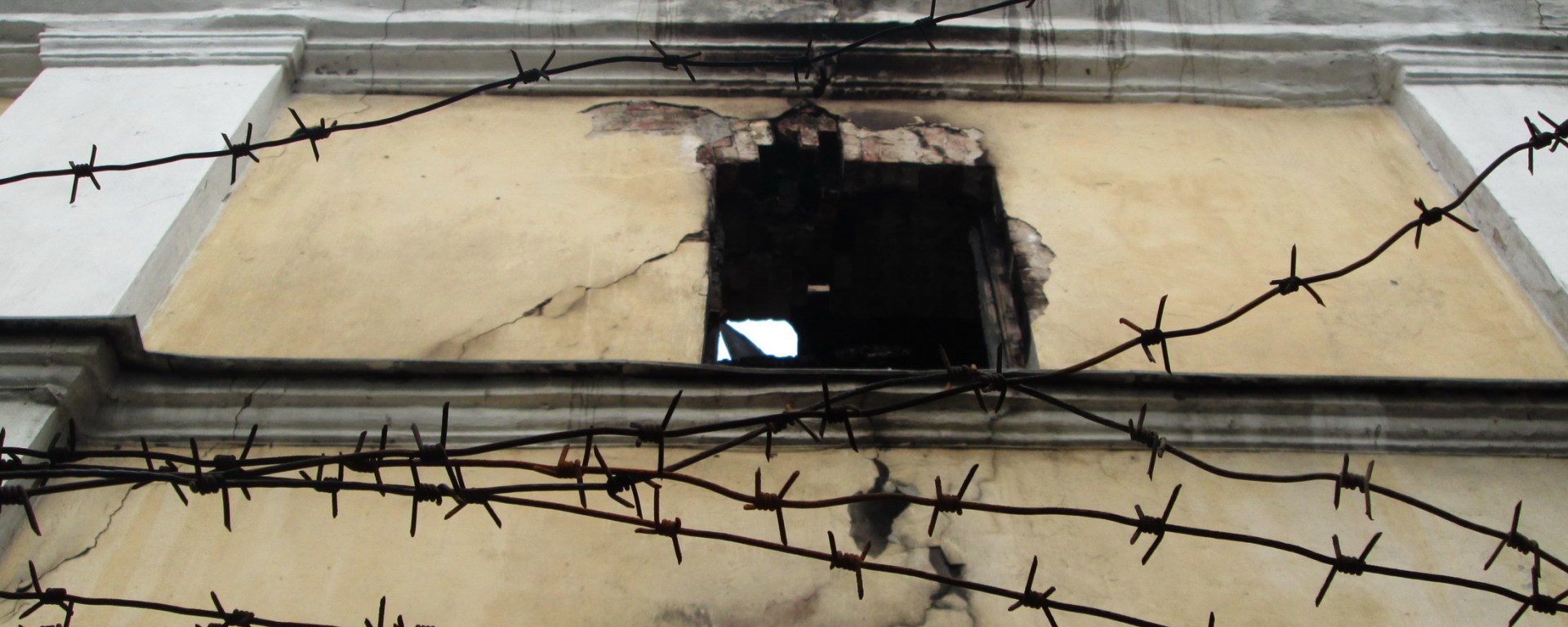 Широкий прямоугольный двор с остатками бывшего фонтана, скрытыми под валяющимся под ногами мусором и автомобильными покрышками. По бокам – два одинаковых длинных здания, в центре – маленький «флигелёк». Замыкает периметр каменный забор с крошечной «сторожкой».