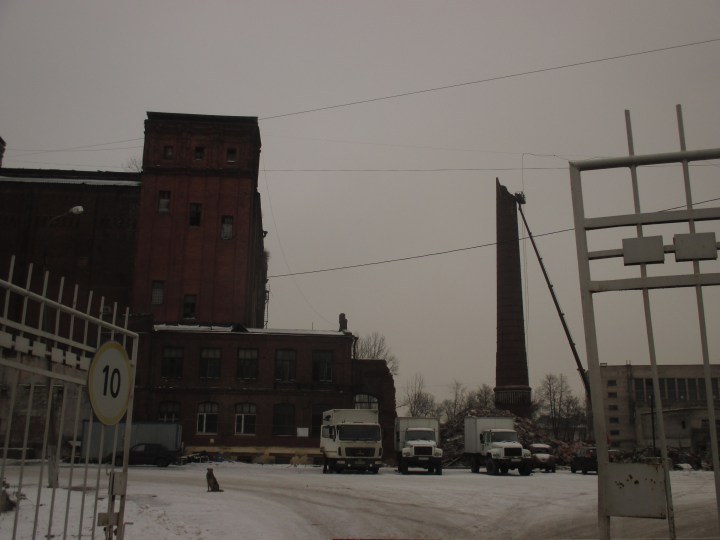 На Черниговской ул., 15 ведётся разборка исторического производственного корпуса и трубы комплекса построек завода льда акционерного общества Санкт-Петербургских товарных складов.