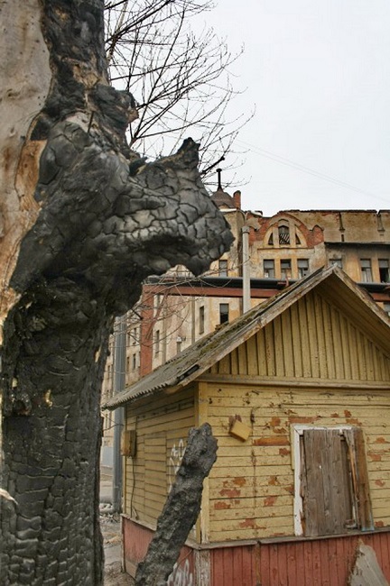 И ужасаемся. Лестница наполовину обрушена (балюстрады, конечно же, нет). Изнутри домик выжжен. И в этих сгоревших комнатах слышны голоса! Приближаемся и понимаем, что встреченные нами люди не совсем адекватны. В округе все уже знают, что несчастный домик стал самым настоящим притоном наркоманов, и наркоманы зовут его «клизмой». А ведь когда-то здесь наверняка и печи были, и лепнина… Короче, всё, что бывает в таких симпатичных маленьких особнячках. Всё выжжено, всё вынесено. Пожары, очевидно, вызваны наркоманскими галлюцинациями. Вот так невесело здесь всё выглядит. И, если домик устоит, его уже точно ждёт реконструкция с полным «потрошением» изнутри. Наркоманы всё для этого сделали…