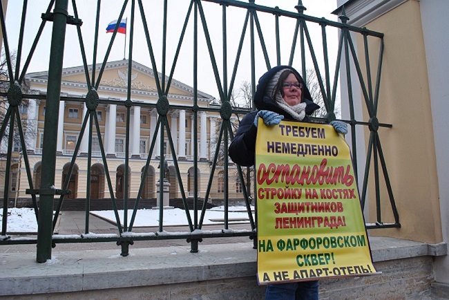 Сегодня утром активисты инициативной группы «Сохраним Фарфоровское кладбище от застройки» провели одиночный пикет у входа в Смольный с требованием немедленно остановить работы на ул. Бабушкина, 40.