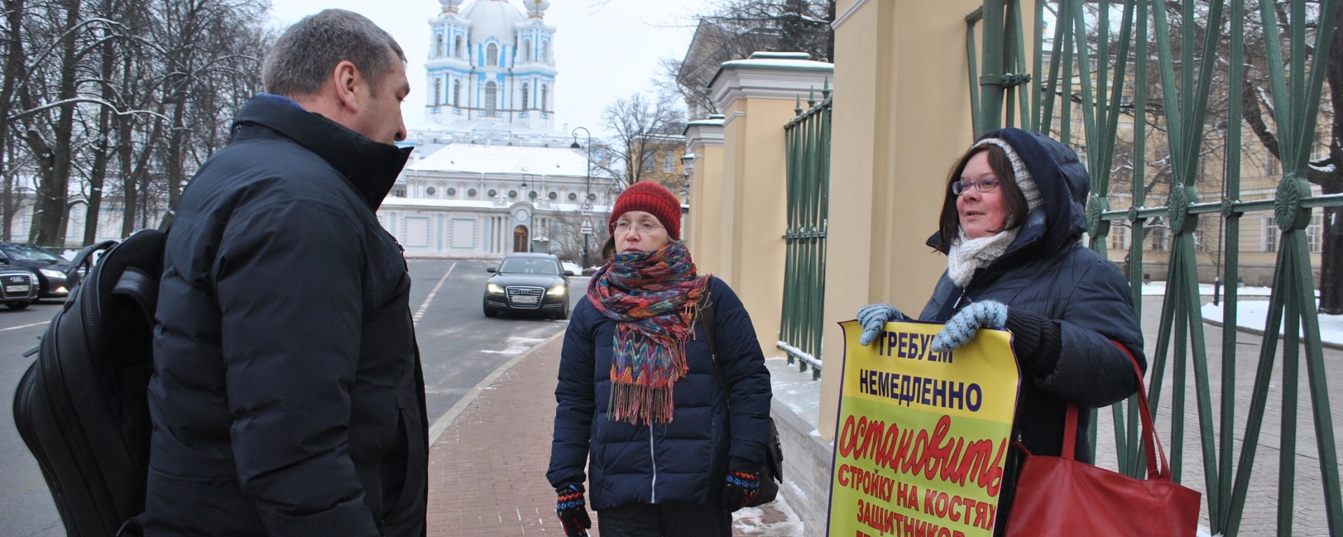 Сегодня утром активисты инициативной группы «Сохраним Фарфоровское кладбище от застройки» провели одиночный пикет у входа в Смольный с требованием немедленно остановить работы на ул. Бабушкина, 40.