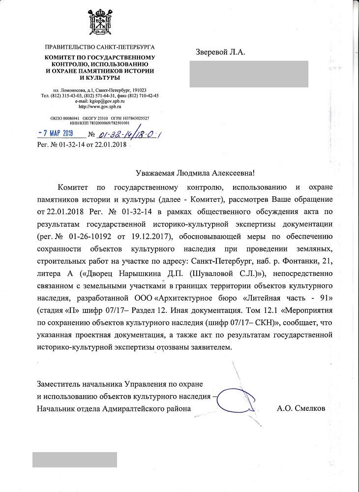 Людмила Зверева также написала в КГИОП о несогласии с выводами экспертизы. В ответ комитет сообщил градозащитнице, что и проект, и экспертиза отозваны заявителем.