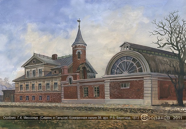 Точная дата постройки деревянного двухэтажного дома неизвестна, Сименс приобрел его у К. И. Миллера в 1858 году. Позже рядом с домом появится завод, на территории которого окажется особняк. В те годы была распространена практика строительства личного дома рядом с предприятием, который обеспечивает нужды его владельца (например, завод «Розенкранц»). Характерной особенностью особняка являлась каменная остроконечная башенка, наделявшая его облик некой сказочностью. Здание подвергалось перестройке несколько раз: в 1873 по проекту Р. Б. Бернгарда и Л. Л. Петерсона, в 1875 архитектором Н. Ф. фон Брюлло, в 1882-1883 гг. К. Ф. Альтманом произведено расширение, в 1886, 1896 гг. – частичная перестройка.