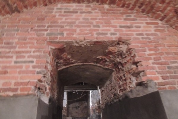 Множественные утраты исторической кирпичной кладки стен – вырублены каналы для прокладки коммуникаций