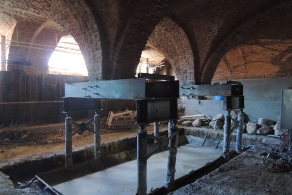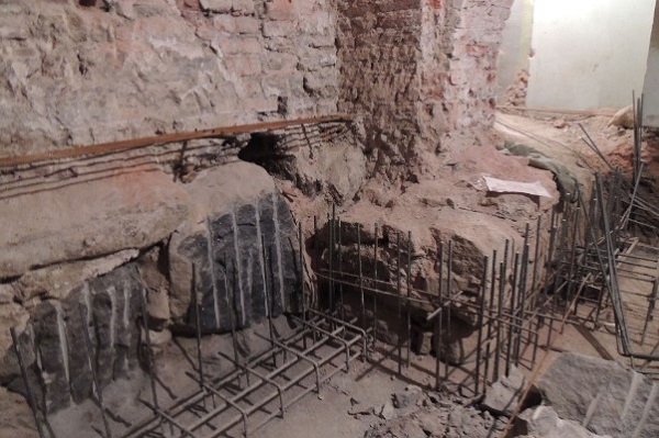 С этой целью устраивается сложная временная конструкция, на которой в подвешенном состоянии находятся кирпичные своды в то время, как уничтожается исторический валунный фундамент и сооружается новый, железобетонный, занимающий меньшую площадь.
