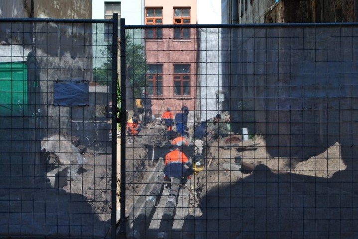 Во время акции на территории Дома Долгоруковых продолжались работы по переносу тепловых сетей. В якобы «аварийном» флигеле находились рабочие, которые хранят в его помещениях строительные материалы.