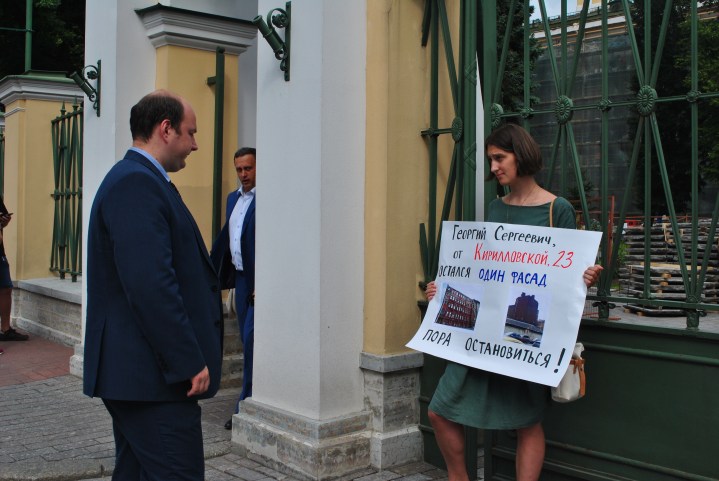 У Смольного проходят одиночные пикеты с требованием сохранить здание и остановить демонтаж. Обращаясь к губернатору, активисты написали на плакате: «Георгий Сергеевич, от Кирилловской, 23 остался один фасад, пора остановиться!»