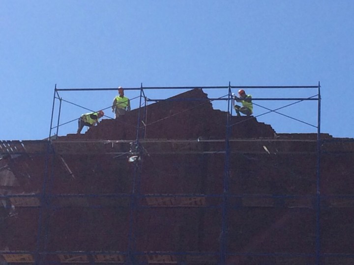 В настоящий момент ведётся разборка торцевой фасадной стены дома. Несколько рабочих сбивают кирпичи кувалдами, они сыпятся на землю.