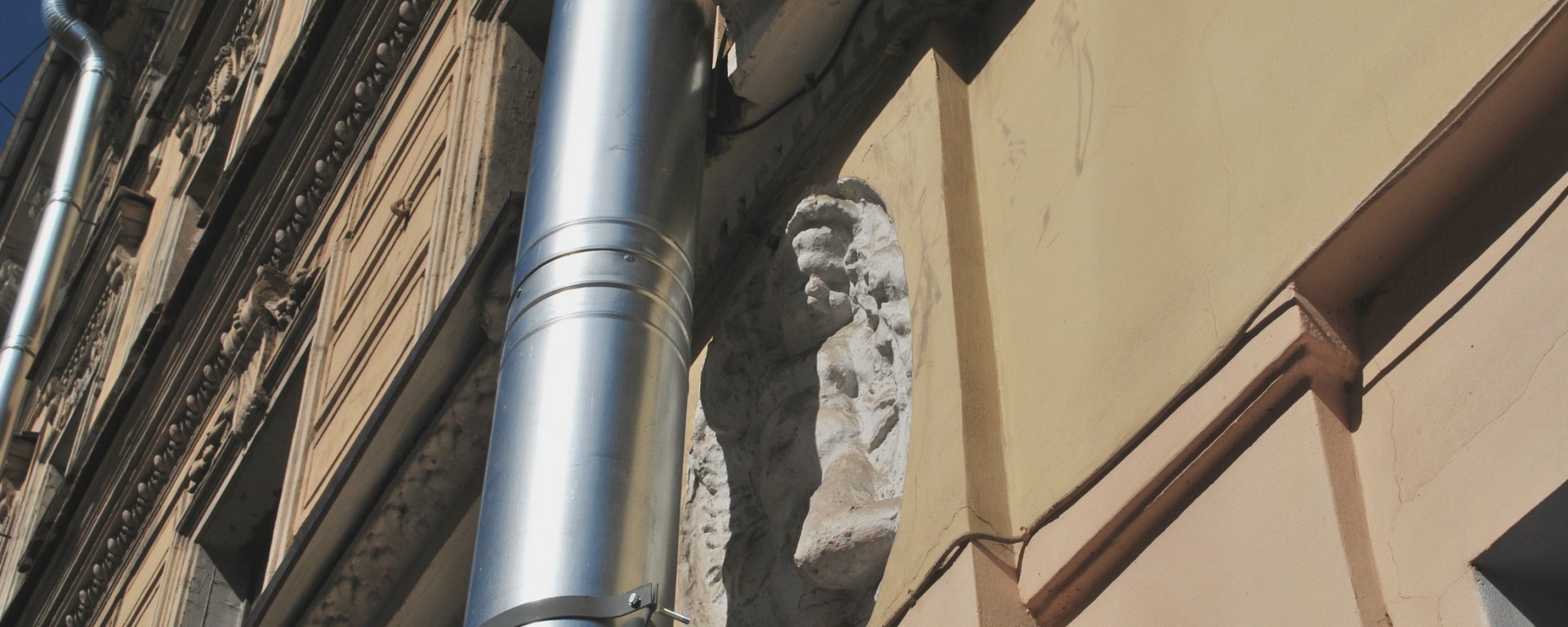 Случившийся на днях инцидент с просверленным, ради установки водосточной трубы, амуром удалось исправить: дыру от инструмента в барельефе заделали, а крепление трубы разместили чуть ниже скульптурного элемента.