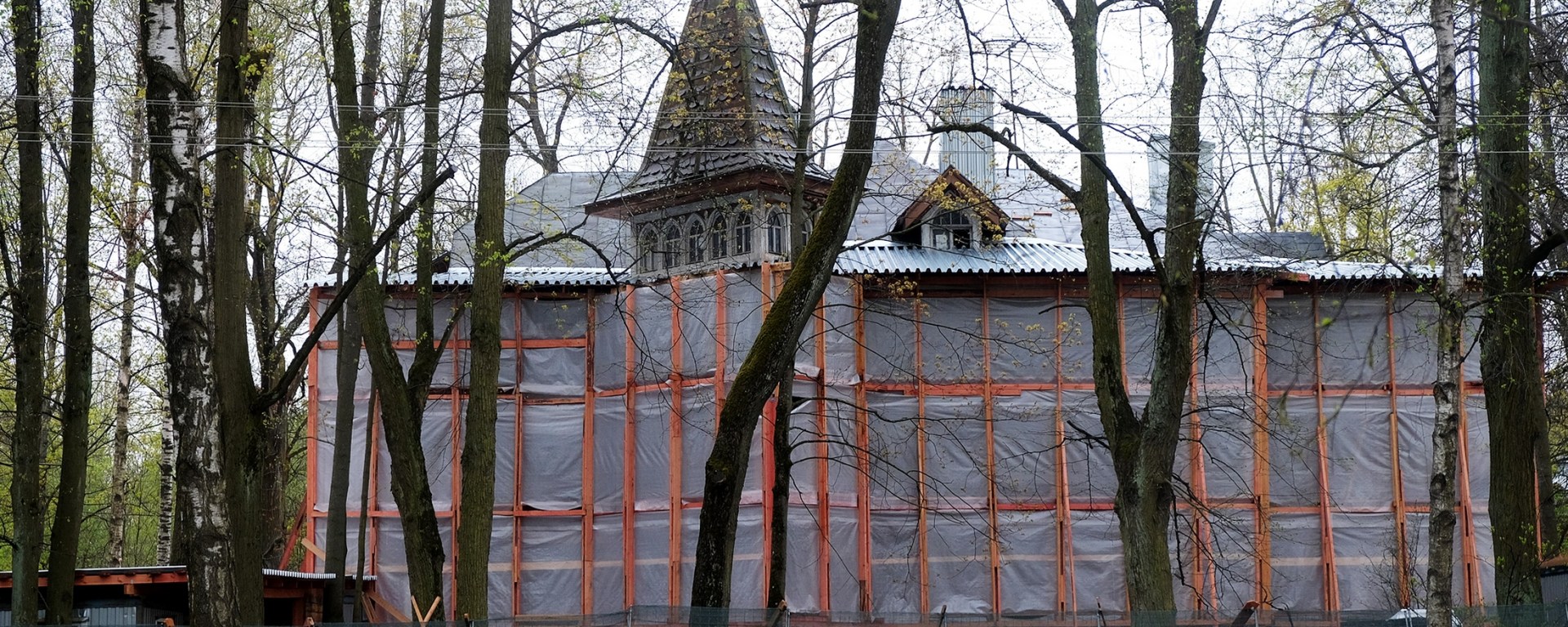 Деревянную дачу на Московском шоссе, 27 в Пушкине ремонтируют. На территории поставили бытовки для рабочих, здание укрыли навесом из армированной пленки.