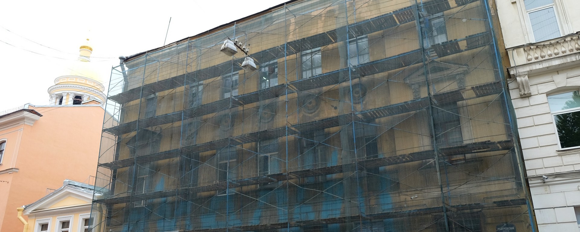 «Градозащитный Петербург» заметил, что на лицевом фасаде установили строительные леса, вечером в помещениях третьего этажа горит свет, появился информационный щит.