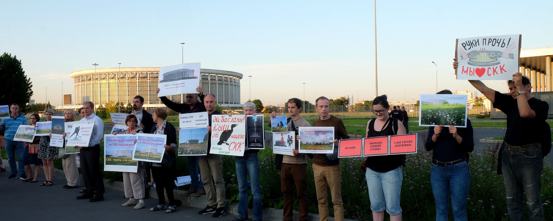 Вечером 28 августа у Парка Победы петербуржцы провели акцию в защиту Спортивно-концертного комплекса «Петербургский» (СКК) и зеленой зоны вокруг него. В ближайшее время власти намерены снести СКК, а на его месте построить новую ледовую арену.