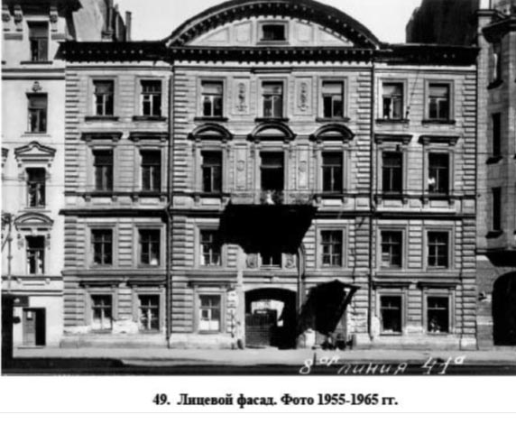Исторически участок дома на 8-ой линии включал четырехэтажный лицевой корпус, дворовый двухэтажный флигель и одноэтажный служебный корпус с конюшнями и каретником у дальней стороны участка, впоследствии перестроенный в двухэтажный флигель.
