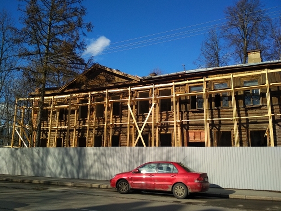 Сруб смотрится чистым, без гнили даже в той части, где ранее был пожар. Информационный щит на объекте отсутствует, сводки заключения КГИОП на работы на официальном сайте нет.
