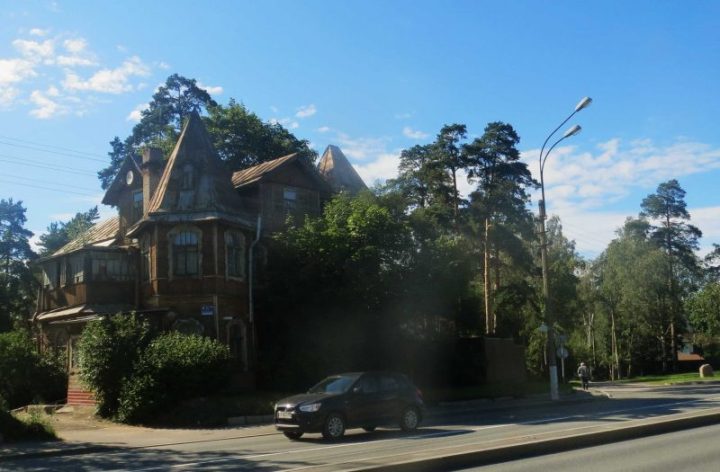 Это красивое здание известно всем, кто проезжает по Приморскому шоссе. Прежде всего оно интересно своим архитектурным решением: это двухэтажный жилой дом в стиле модерн с пристроенной конусовидной башенкой, мезонином и остекленной верандой. В доме сохранились исторические оконные и дверные заполнения, оригинальная обшивка фасада, фигурные наличники, резной карниз.