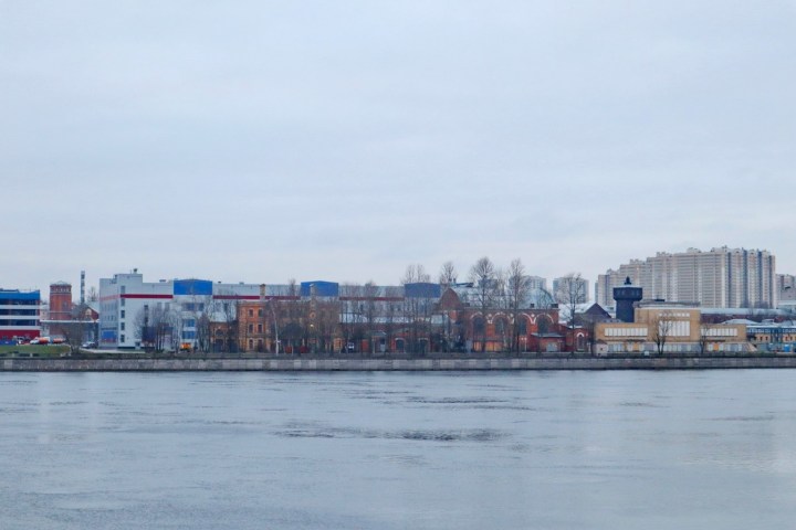 И нельзя не отметить, как идеально ложится основной цвет фасадов в тон этой унылой серой воде и этому беспросветно-низкому серому небу. Вот скажите, они что, это специально? Откуда только такая любовь к беспросветно-серому в современной России (вспомним ту же РЖД)? А сочетание бордового, синего и темно-серого? Разве это солидно, или хотя бы красиво?