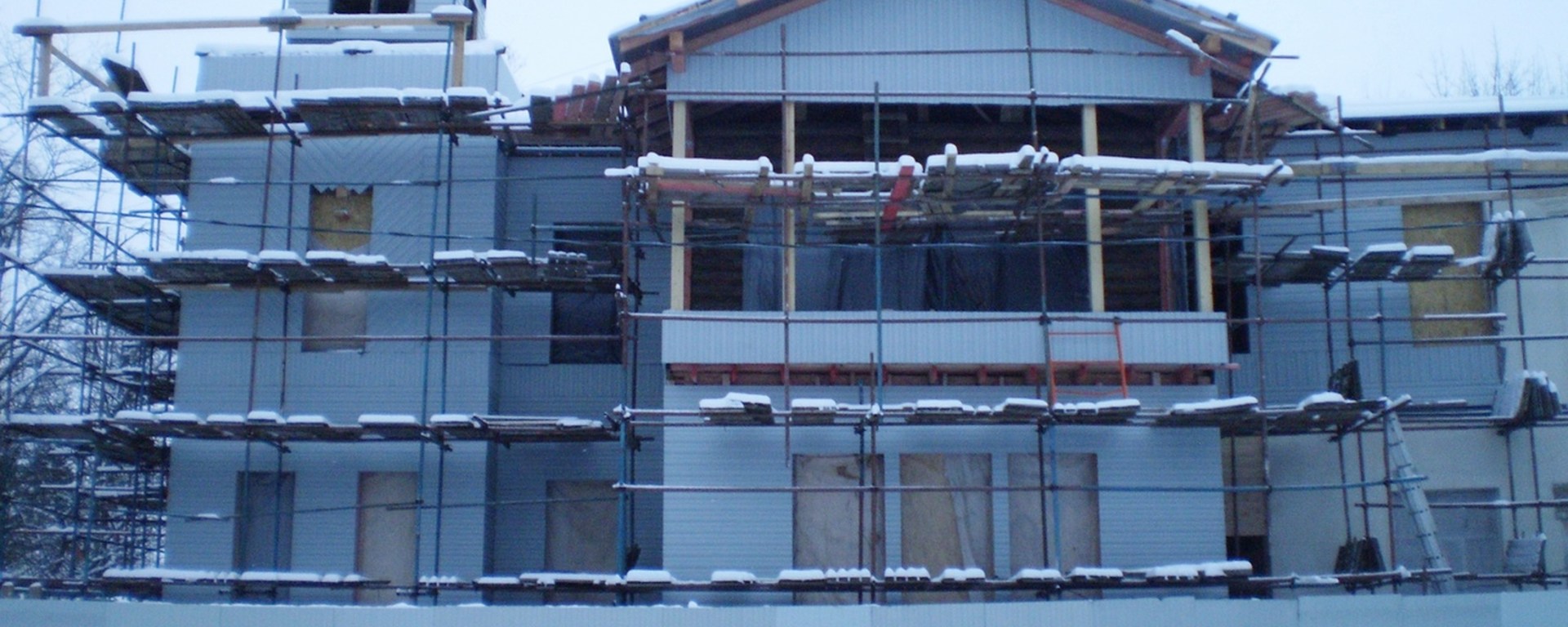 Проектом предусмотрено восстановление дачи и приспособление ее под жилой дом. Под деревянной частью здания в настоящий момент устроен бетонный пол и подвальный этаж с опорными колоннами. Сруб при этом был поднят на домкратах и без разборки перенесен на новую основу – монолитный фундамент. Нижние венцы, поврежденные гнилью, были заменены. Проект реставрации памятника с приспособлением под современное использование разработало ООО «НИиПИ Спецреставрация». Подрядчик работ на объекте — ООО «СЕКОНДА ВИТА». Подробнее о работах мы писали в прошлом материале.
