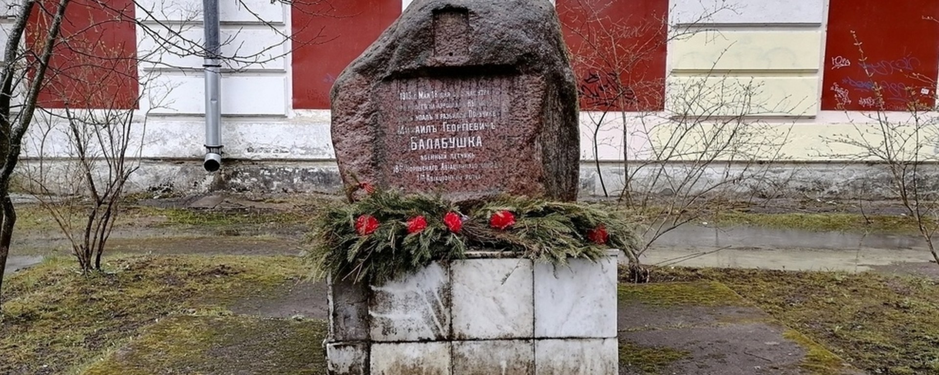 Памятник Михаилу Георгиевичу Балабушке находится в Суворовском городке близ ж/д станции Новый Петергоф. Заявление о выявление подготовил в мае этого года местный краевед и активист Кирилл Белоусов.