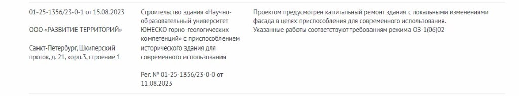 После этого, в КГИОП был направлен эскизный проект строительства здания «Научно-образовательный университет ЮНЕСКО горно-геологических компетенций», который предполагает капитальный ремонт и приспособление современного использования строения 1, которое располагается в «строгой» зоне ОЗ.