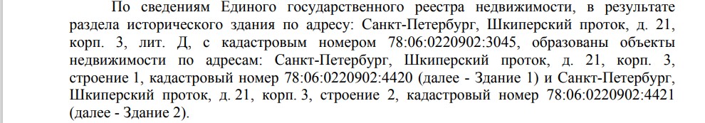 На этом приключения дореволюционного склада под литерой Д, как вы догадались, не заканчиваются: как стало известно градозащитнице Анне Капитоновой из ответа КГИОП, части здания, которые попали в разные зоны, разделили в кадастре. То есть, они стали разными объектами недвижимости с адресами: Шкиперский проток, 21 строение 1 и строение 2.